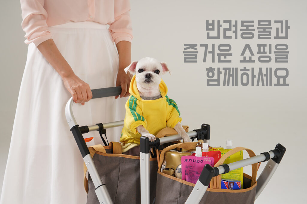 이미지에서 보시는 것처럼 두 개의 장바구니를 걸어서 사용할 수 있고 경우에 따라서는 반려동물 전용 백을 이용해 반려동물과 같이 쇼핑할 수 있습니다. 접었을 때는 중형 이상의 자동차 트렁크에 가로로 들어갈 수 있는 사이즈입니다.